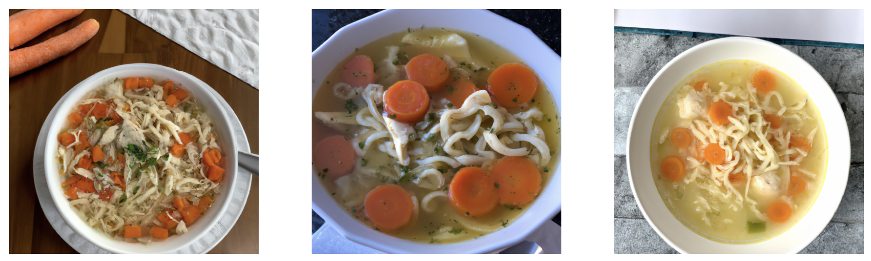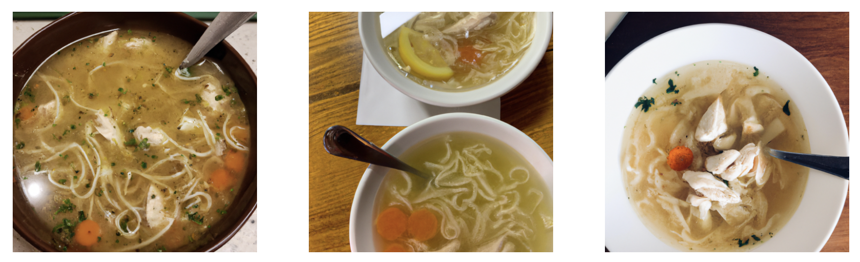 After more tweaks, we added an AI-generated photo for "Chicken noodle soup" to our growing menu that compares well to our "real" photos (recipe #2 and #3).